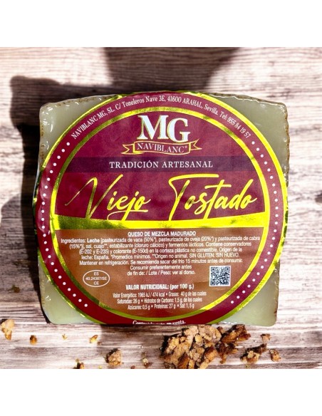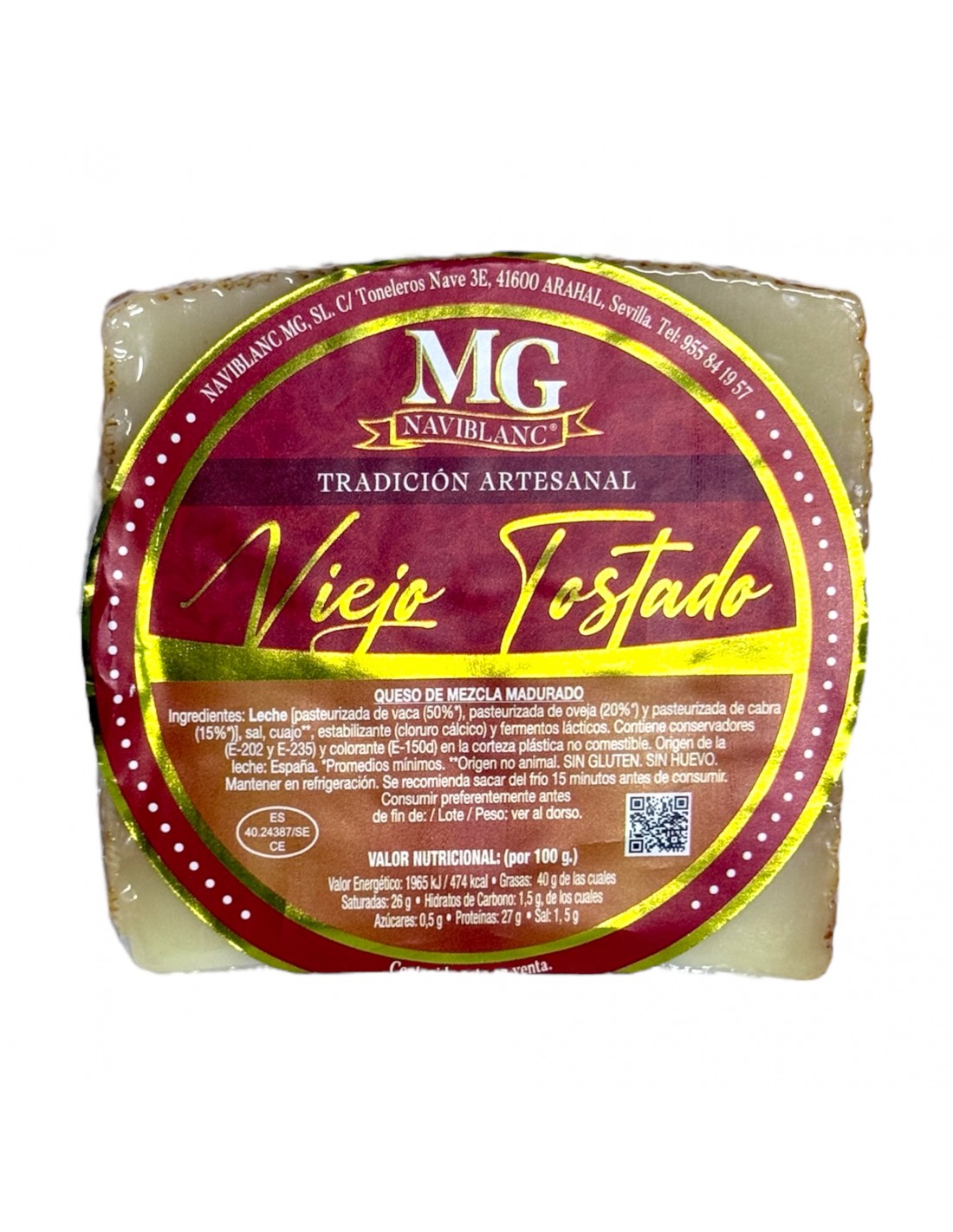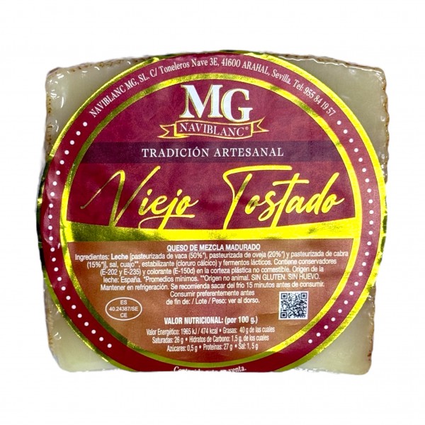 Elaborado con leche pasteurizada de vaca, oveja y cabra, este queso viejo tostado destaca por su sabor potente y profundo, con notas maduras y un ligero toque tostado que realza su personalidad. Su afinado prolongado le aporta una textura firme y un aroma intenso, ideal para los paladares que buscan quesos con carácter.