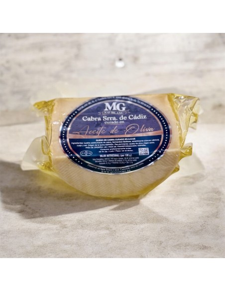 Elaborado con leche pasteurizada de cabra, este queso curado de la Sierra de Cádiz se afina cuidadosamente y se recubre con aceite de oliva virgen extra, lo que le aporta una textura suave en boca y un sabor intenso, redondo y lleno de matices.