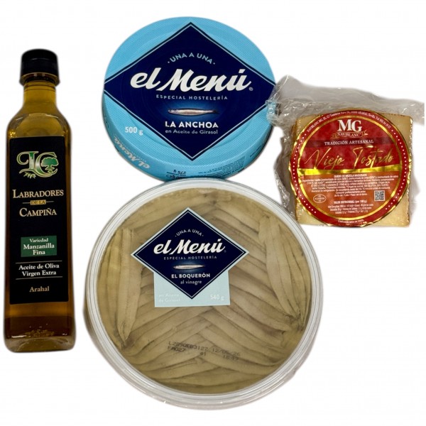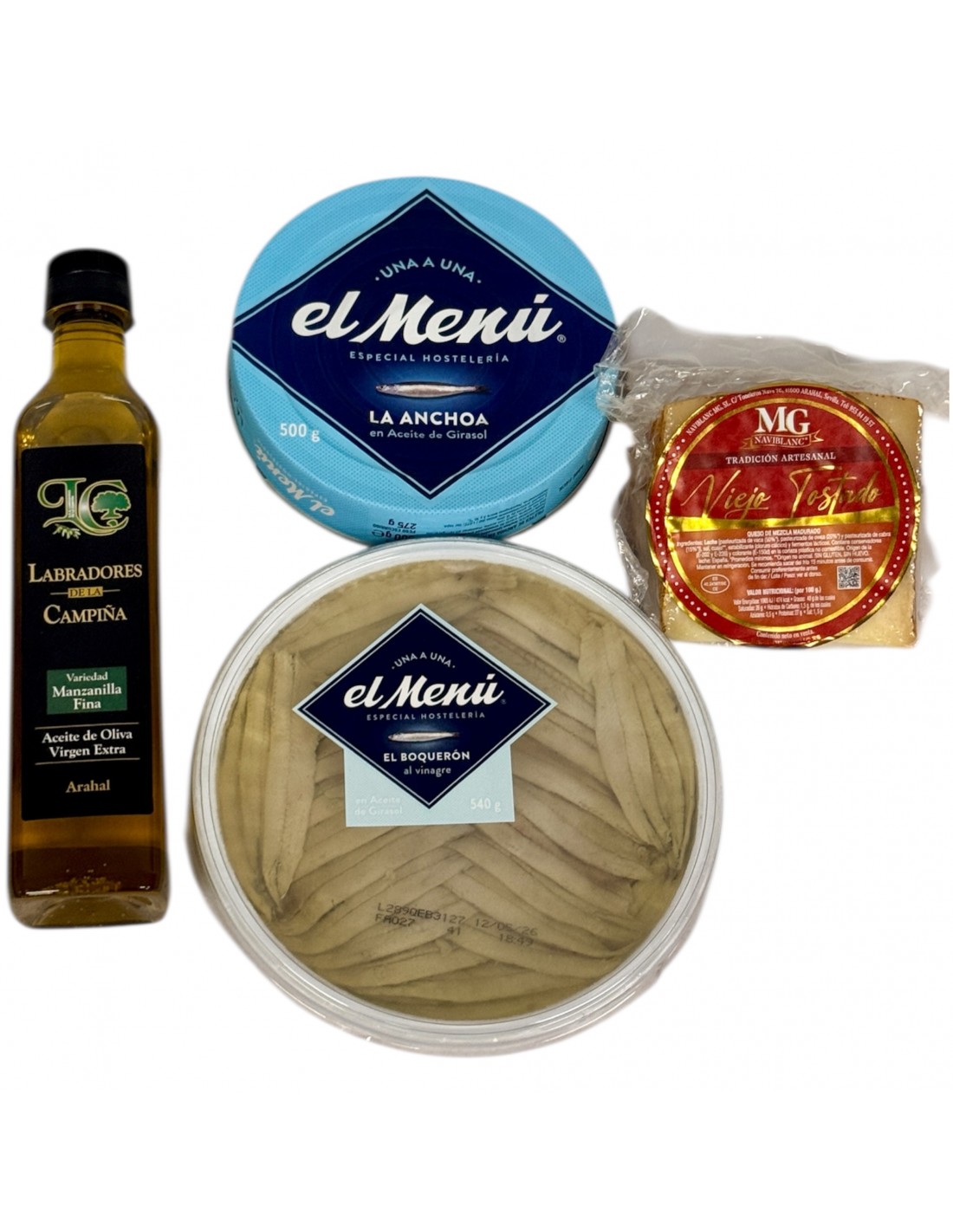 Pack gourmet ideal para disfrutar de un aperitivo especial. Incluye aceite de oliva virgen extra variedad manzanilla fina, anchoas y boquerones seleccionados, y queso tostado. Una combinación equilibrada de sabores del sur, perfecta para compartir y disfrutar sin prisas.