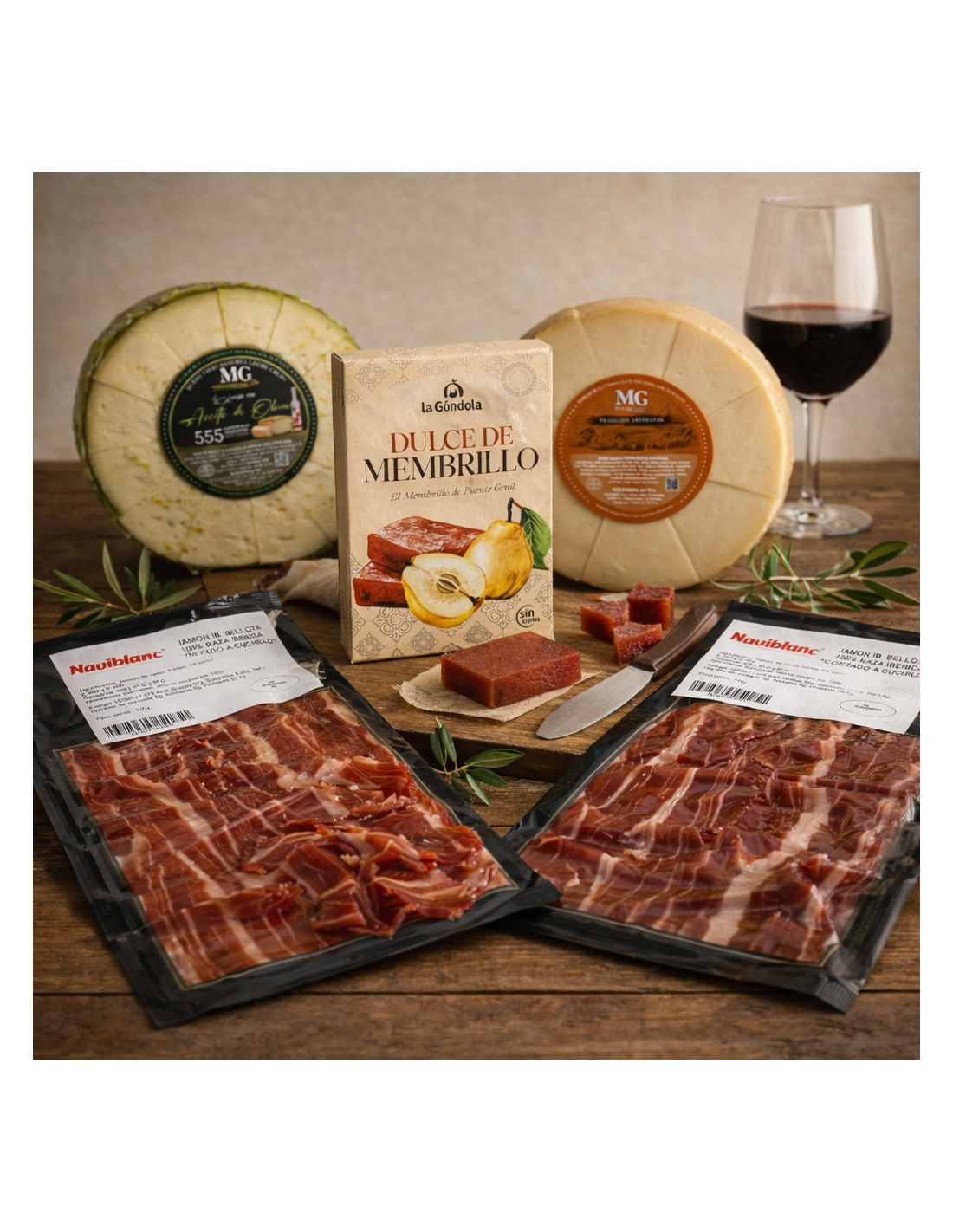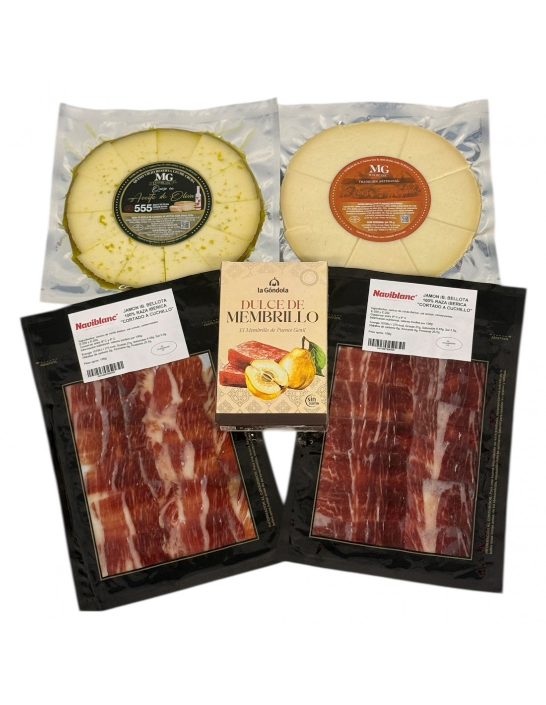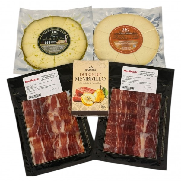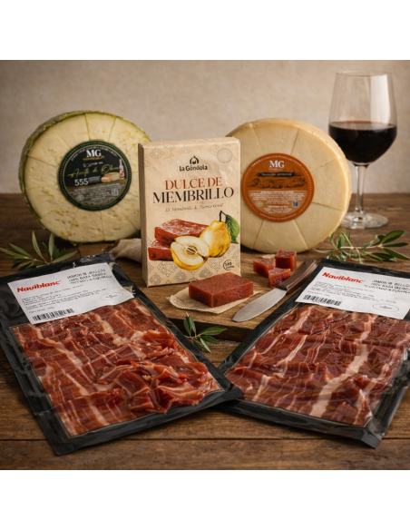 Pack gourmet pensado para disfrutar de los grandes clásicos. Incluye jamón ibérico de bellota 100% cortado a cuchillo, una selección de quesos premium y dulce de membrillo tradicional. Una combinación equilibrada de sabores intensos y dulces, perfecta para compartir, regalar o darte un auténtico capricho.