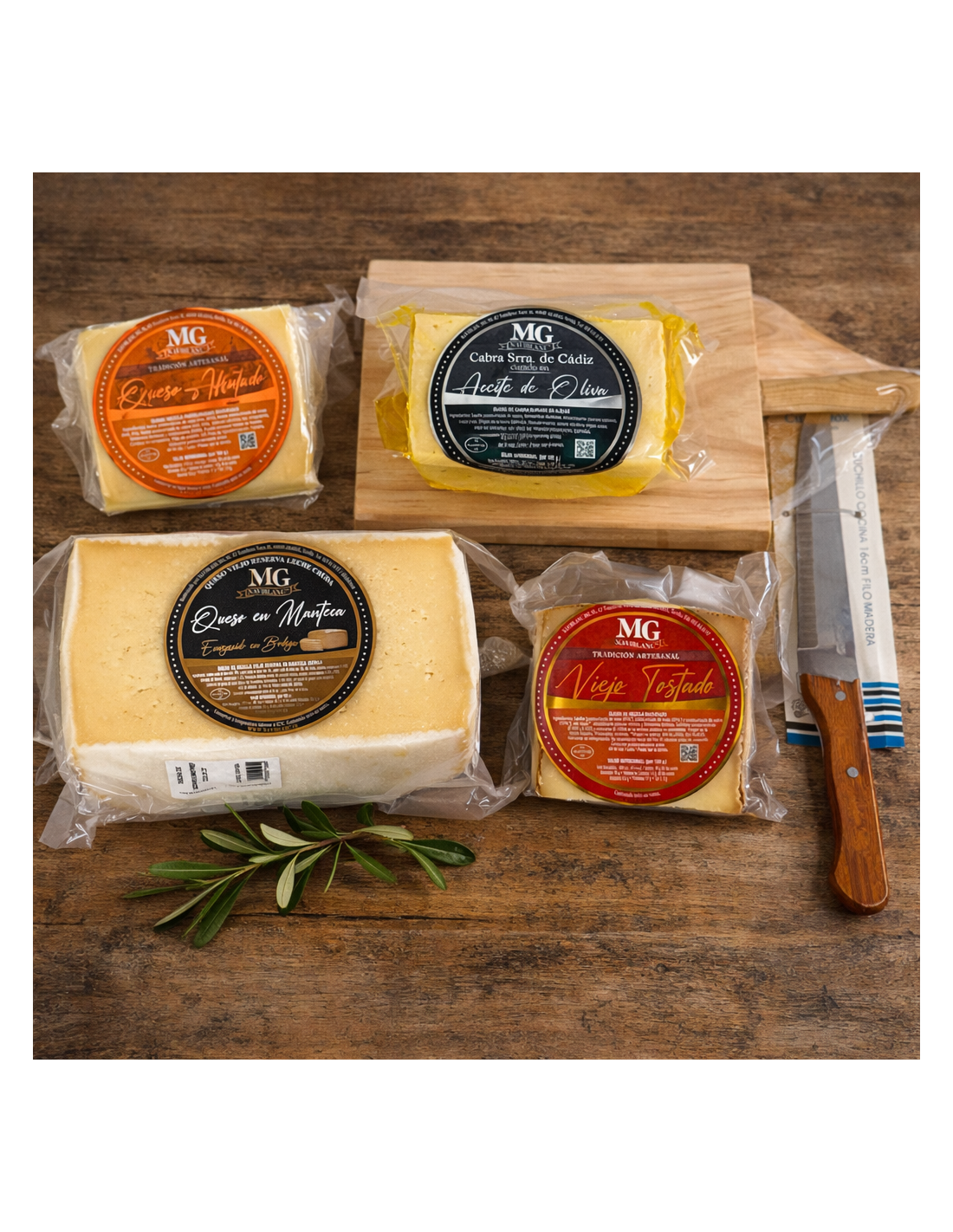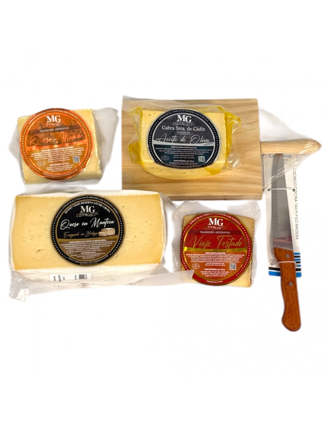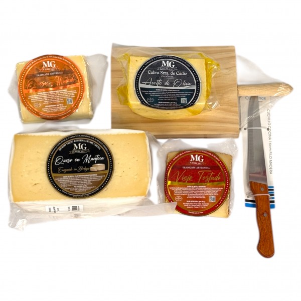 Pack gourmet pensado para los auténticos amantes del queso. Incluye una selección de quesos curados, viejos, tostados y afrutados, todos de la marca MG Naviblanc, acompañados de un práctico cuchillo y tabla de madera para servir. Una experiencia completa para degustar, compartir o regalar, que convierte cualquier momento en un verdadero festín quesero.