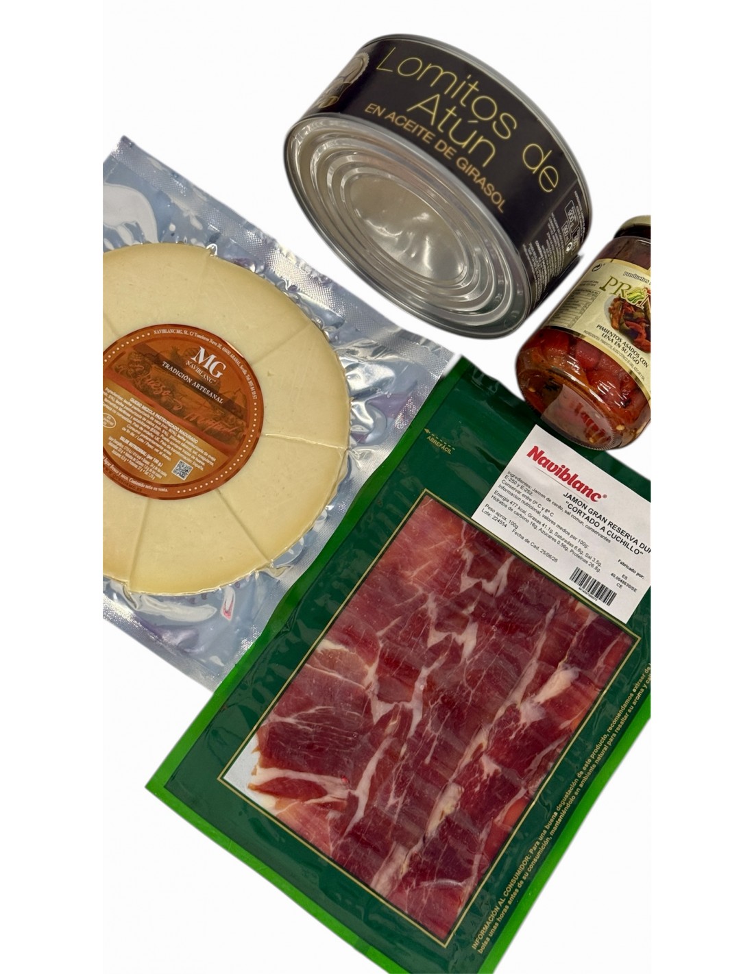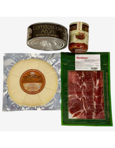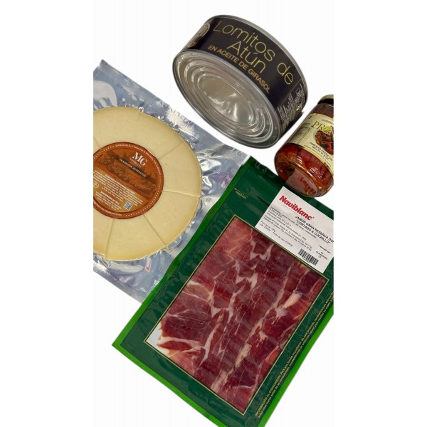 Pack gourmet que combina lo mejor del mar y de la tierra. Incluye lomitos de atún en aceite, jamón gran reserva loncheado a cuchillo, queso afrutado en plato y pimientos asados de primera calidad. Una selección pensada para disfrutar como aperitivo, en tapas o como regalo gourmet, capturando los auténticos sabores del sur de España.