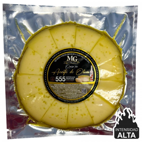 Queso viejo reserva MG cortado y emplatado al vacío, conservado en aceite de oliva virgen extra premium de Málaga. Un formato práctico y elegante que permite disfrutar de un queso intenso y lleno de carácter sin necesidad de cortar ni preparar nada: abrir el sobre, volcar en un plato y listo.